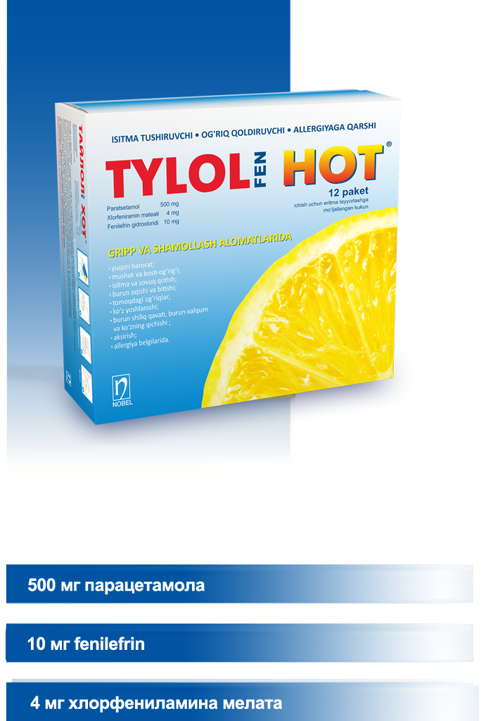 Tylol Fen Hot — ваше надежное средство от простуды и гриппа, обеспечивающее быстрый и эффективный результат всего за 30 минут. В состав входят 500 мг парацетамола, 10 мг фенилэфрина гидрохлорида и 4 мг хлорфенирамина малеата. Он борется с такими распространенными симптомами, как головная боль, высокая температура, боль в суставах, насморк и постоянный кашель.