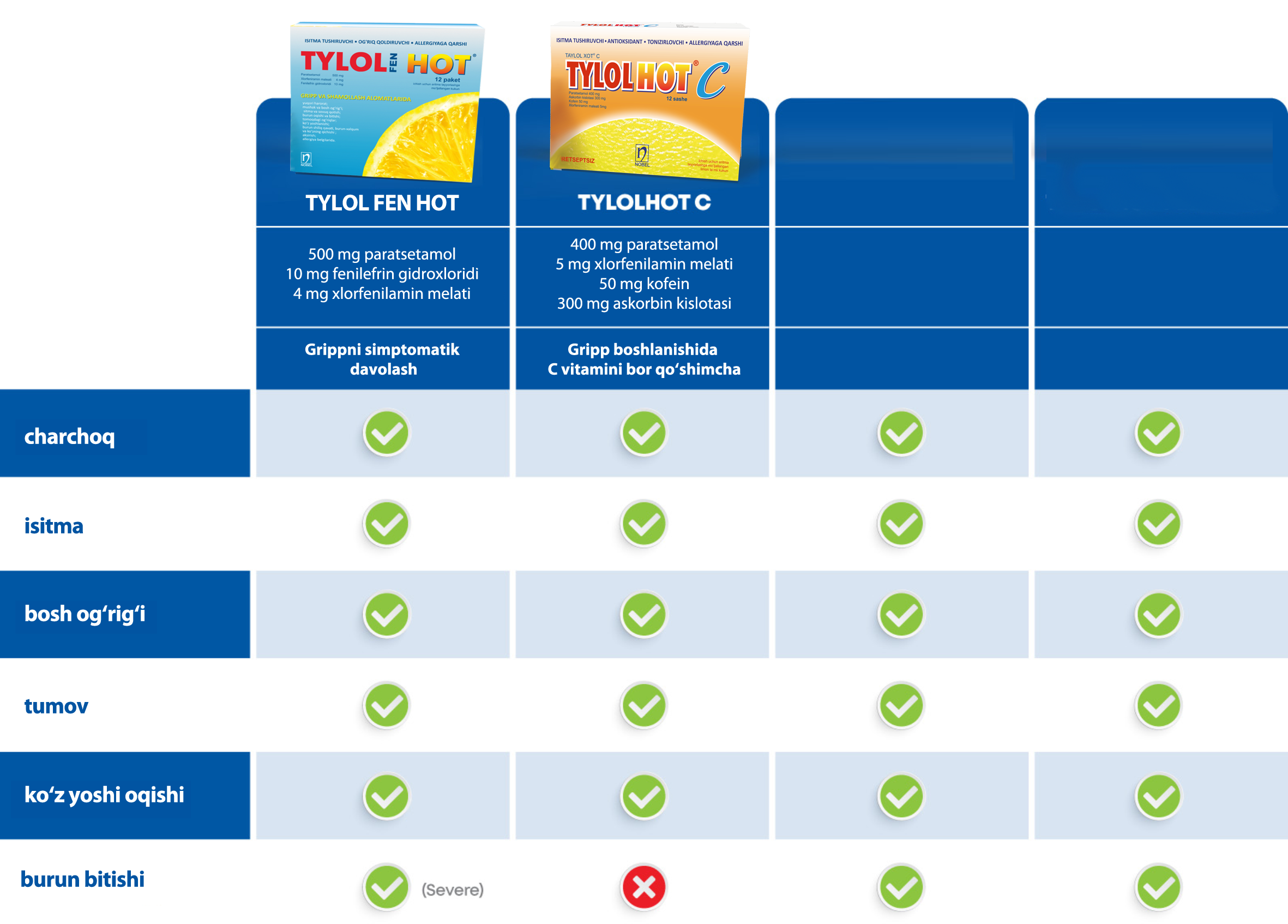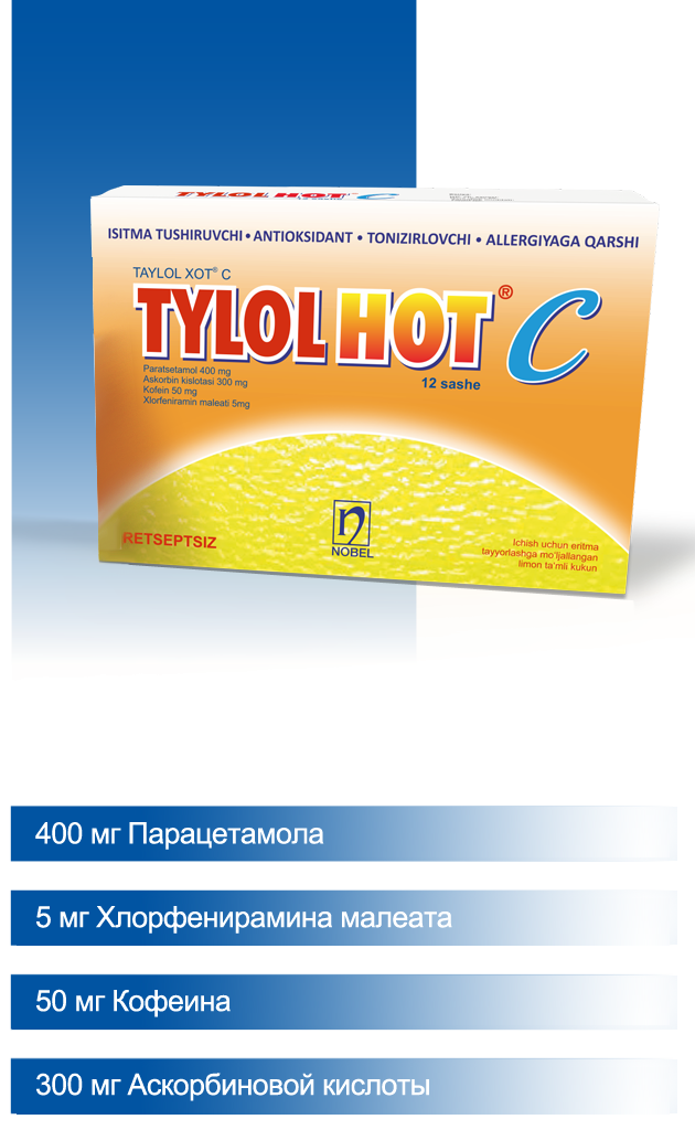 Tylol Hot C помогает облегчить такие распространённые симптомы, как головная боль, высокая температура, боль в суставах, насморк и постоянный кашель. Его быстродействующая формула обеспечивает облегчение уже через 30 минут, позволяя вам быстро вернуться к привычному образу жизни.